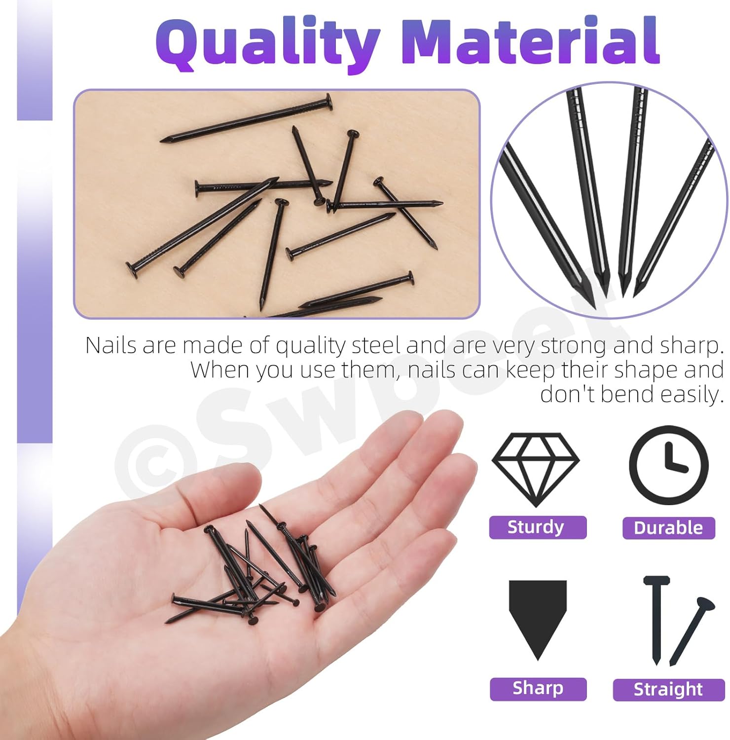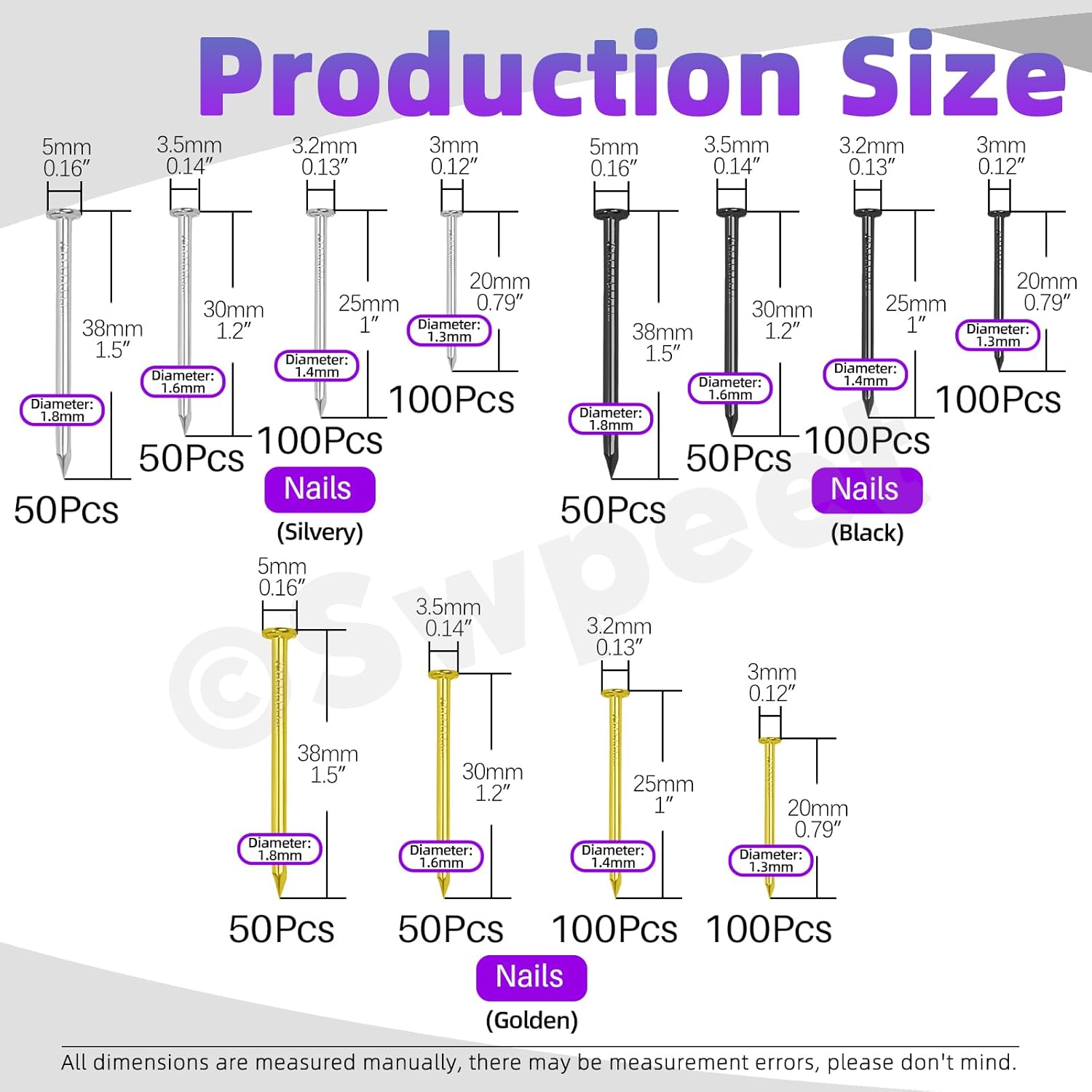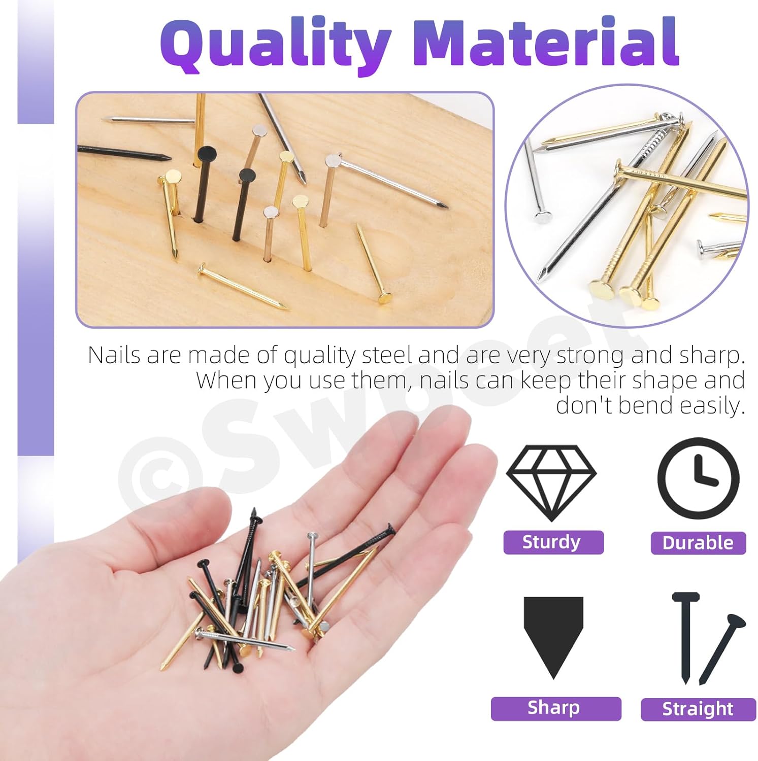 👑 Swpeet 900Pcs 4 Sizes Hardware Nails Assortment Kit, Silver Galvanized Nails, Small Nails, Pin Nails, Finishing Nails, Nails for Hanging, Wall Nails for Hanging Pictures 👑 Why Choose Us? 🏅 1.Durable Nails ✨ Made from high quality steel, with galvanized coating our nails are extremely corrosion resistant, strong and sharp. 🏅 2.Sharp and Strong ✨ When used, Nails retain shapes and resist bending, ensuring reliable performance. Pierce various types of materials. 🏅 3.Wide Applications ✨ Used for interior framing, carpentry, building boxes. Ideal for hanging photos, mirrors, and other decorations around the house. Also suitable for creating various DIY wooden crafts. 👑 Specifications ✨ Product Name: Nails ✨ Material: Steel ✨ Size: 0.12"×0.79", 0.13"×1", 0.14"×1.2", 0.16"×1.5" ✨ Color: Silver 👑 Package Includes: ✨ 100Pcs -------- 0.12"×0.79" Silver Nails ✨ 100Pcs -------- 0.13"×1" Silver Nails ✨ 50Pcs -------- 0.14"×1.2" Silver Nails ✨ 50Pcs -------- 0.16"×1.5" Silver Nails ✨ 1Pc -------- Storage Box ✨ In total 501Pcs