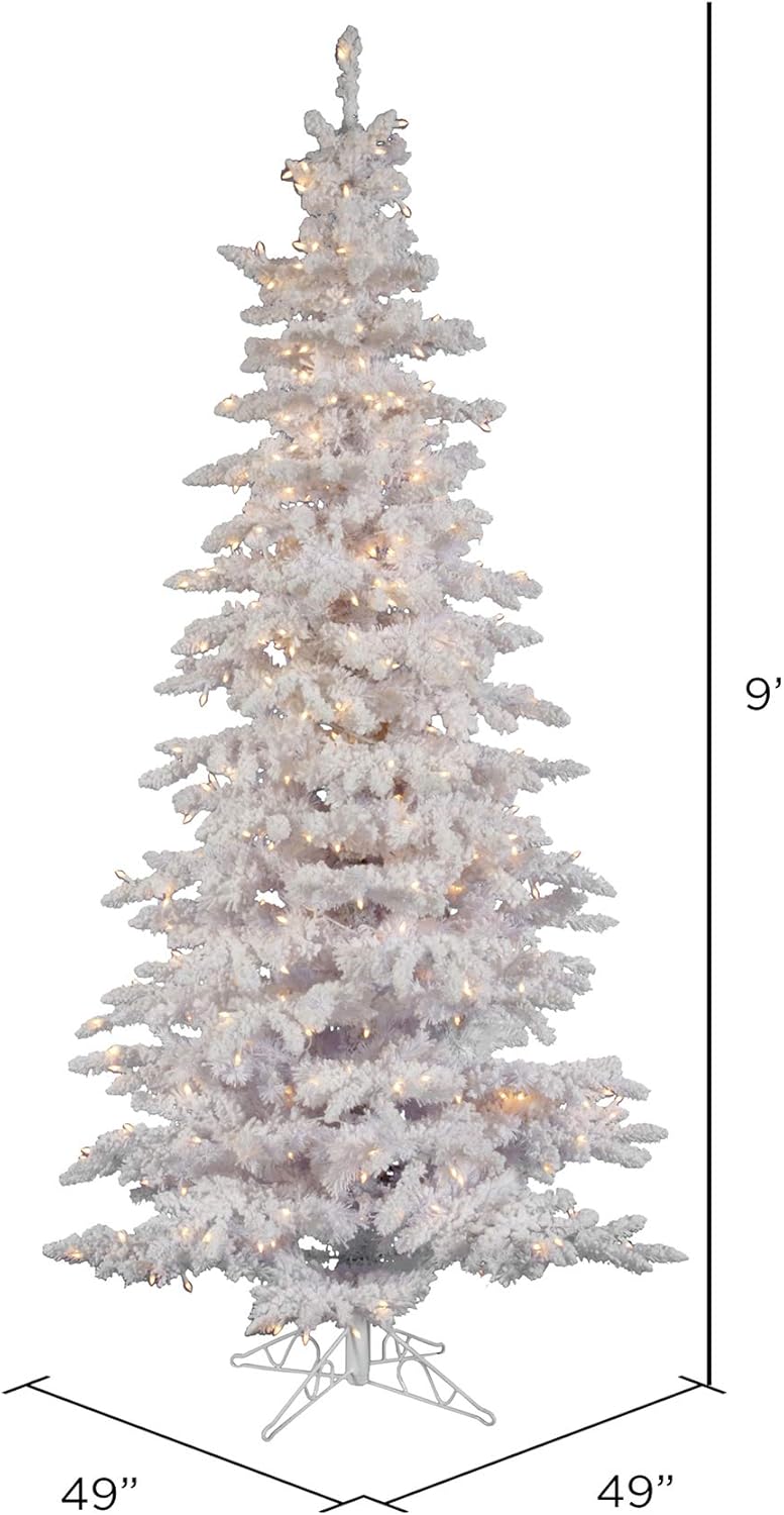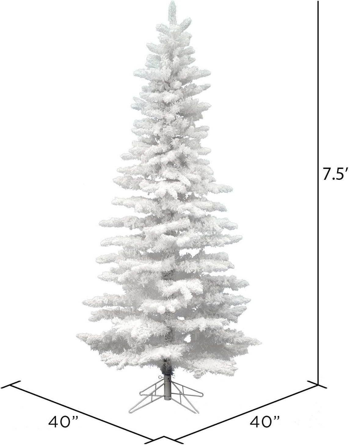 Vickerman Artificial 6.5' unlit flocked White Slim Christmas tree featuring 744 PVC tips. This tree comes unlit, features beautiful white flocked tips on metal hinged branches and a Metal tree stand is included. For additional complimentary accents see the many wreaths and garlands available from Vickerman. This durable tree is maintenance free and will suit any decor. Vickerman has been an industry leader since 1940. Enjoy this expert designed seasonal tree around your home.