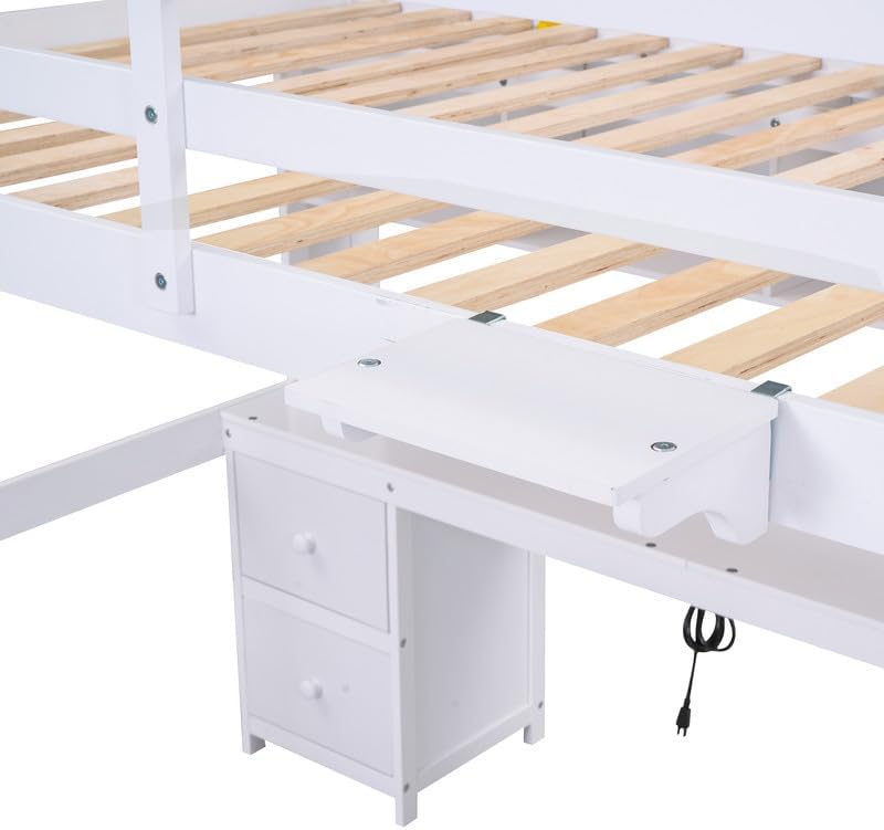 Full Size Loft Bed with Desk, Cabinets, Drawers, Bedside Tray & Charging Station – White◆ Key Features:1. Multifunctional Design: Combines a loft bed, desk, storage cabinets, drawers, and a tray2. Built-In Charging Station: Includes 2 outlets and 2 USB ports for added convenience3. Ample Storage: 4 cabinets, 4 drawers, and a bedside tray keep everything organized4. Sturdy & Durable: Constructed from pine wood and MDF for long-lasting use5. No Box Spring Needed: 14 slats provide mattress support6. Clean White Finish: Complements a wide range of interior styles◆ Specifications:Product Type: Loft Bed with Desk and StorageSize: FullColor: WhiteMaterial: Pine Wood + MDFSlat Count: 14Box Spring Required: NoAssembly Required: YesCountry of Origin: Vietnam◆ Weight & Dimensions:Overall Dimensions: 78.4"L x 57.6"W x 65.8"HBed Dimensions: 76" x 54"Recommended Mattress Thickness: 6"Weight Capacity: 600 lbsOverall Product Weight: 182 lbs◆ Package Details:Package 1 : 57.87" x 21.26" x 6.69", 112.44 lbsPackage 2 : 79.53" x 13.39" x 5.91", 77.16 lbs