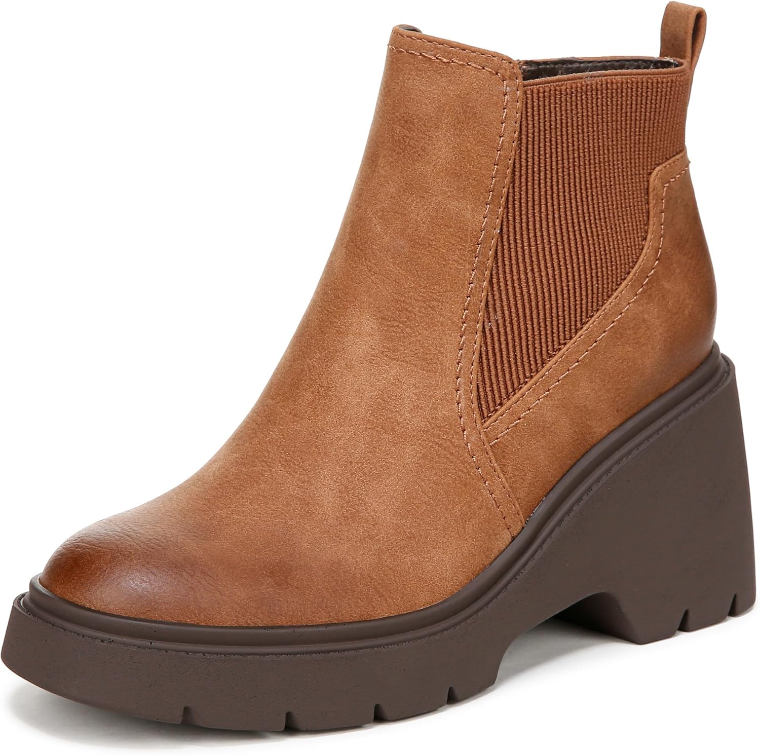 The platform boot from SOUL Naturalizer // Fall feels. You'll love everything these boots with a lug sole have to offer. Ankle bootie with chelsea boot-inspired goring for extra flexibility. Synthetic upper with 100% recycled lining and a closed round toe. Side zip closure, back pull tab and elastic goring panel. ContourFIT technology: sculpted insole, soft foam lining, arch support with memory foam, lightweight and flexible outsole. 3/4 inch platform, 3 inch block heel. 3.43 boot height; 9.05 cm circumference. Note: Measurements based on size 6 boot. For each half size larger, shaft height increases by . 12 inches, circumference by . 20 inches. Consciously packaged: 100% of our shoe boxes are made of 80% recycled paper + soy-based ink. Toe box and heel counter crafted from partially recycled materials. WHY YOU'LL LOVE IT: Forever elegant silhouettes with all day wearability, available in an inclusive range of sizes and widths. Designed to the contours of a woman's foot. The Beautiful Fit. Since 1927.