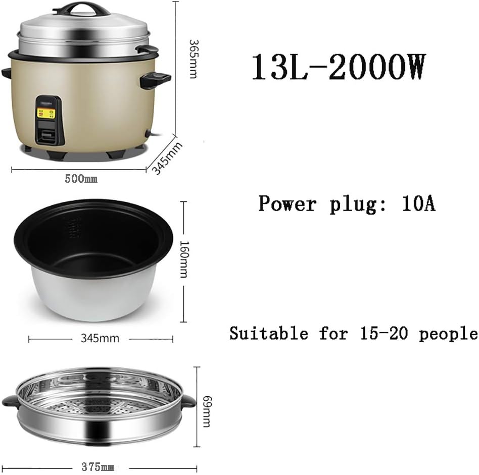 Heating method: chassis heatingControl method: mechanicalSpoon: 1Stainless steel steamer: 1Liner material: black gold non-stick liner8L-1350W is suitable for 4-8 people10L-1600W is suitable for 10-15 people13L-1600W is suitable for 15-20 people18L-1600W is suitable for 20-30 people, 16A socket23L-3500W is suitable for 30-40 people, 16A socketFunction: cake, claypot rice, miscellaneous rice, porridge, boiled noodles, syrup, yogurt, etc.Note: 1.The number engraved in the liner is not the size of the pot, it is the ratio of water to rice, please understand.2. Please don't worry about the voltage problem, we will give a local conversion plug according to your address.